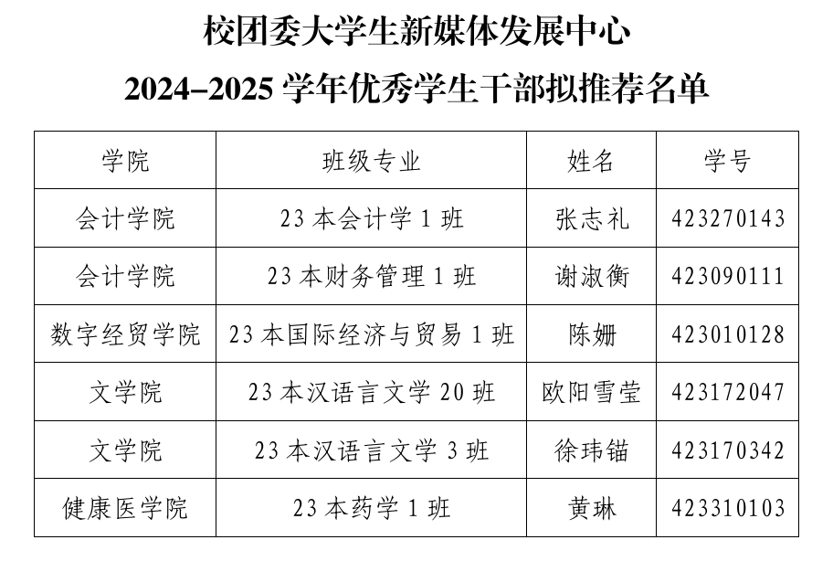 经校团委大学生新媒体发展中心学生骨干自主报名、校团委大学生新媒体发展中心测评小组审核,现拟推荐张志礼等6位同学参评广州华商学院2024-2025学年优秀学生干部。
