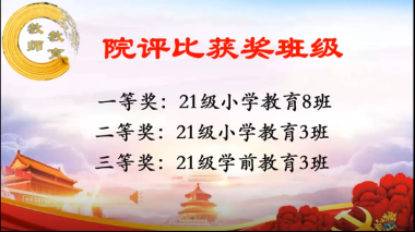 宣读教师教育学院三月班级团生评比获奖班级:荣获三等奖的班级是21级学前教育3班,荣获二等奖的班级是21级小学教育3班,荣获一等奖的班级是21级小学教育8班。