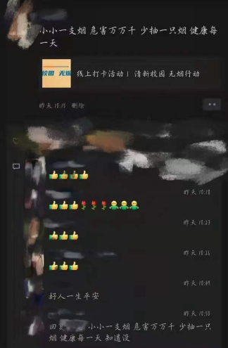 本次活动共分为两个部分,第一部分为线上禁烟打卡活动。3月7日早上9点,打卡活动一经开始,同学们纷纷响应号召,加入到禁烟宣传的活动中来,让更多人了解烟草危害,携手绘出清新的无烟校园。以下是线上打卡活动中的优秀禁烟宣传语,我们都能真切地感受到大家对建设无烟校园的决心!