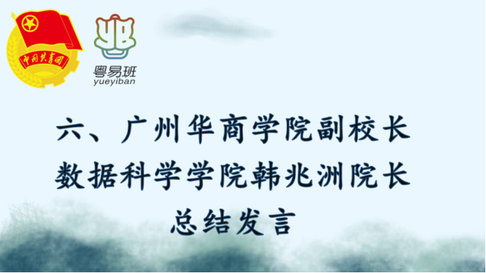 大会第六项为广州华商学院副校长数据科学学院韩兆洲院长总结发言。韩兆洲副校长首先表达对在校同学与暂缓返校同学的关心,希望同学们能把握好大学时光,坚定理想信念,培育高尚品格,在方方面面努力提升自我,增强自身综合素质和实践能力。