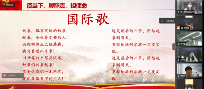 为落实“三会一课”制度、加强党员教育管理、促进党员发挥先锋模范作用,结合当前疫情防控形势,数据科学学院学生第三党支部于2022年4月25日以线上的方式开展“疫当下,履职责,担使命”党日主题活动。参与本次会议的有数据科学学院学生第三党支部书记官志豪老师以及支部全体党员,会议由李嘉乐同志主持。