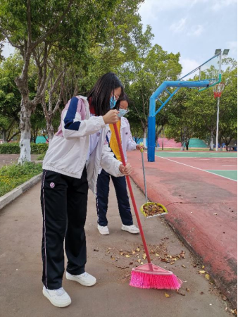 集合完毕并签到完成后,志愿者按照分配好的工作内容在指定地点进行清扫。活动过程中,志愿者们听从安排,团结一致,细致地进行清扫工作,认真清扫篮球场地面上的树叶和垃圾,保证运动场地干净整洁。负责人在旁维持清扫的秩序并检查各位志愿者的清扫结果。炎炎烈日,在志愿者们的共同努力下,篮球场很快就变得焕然一新。