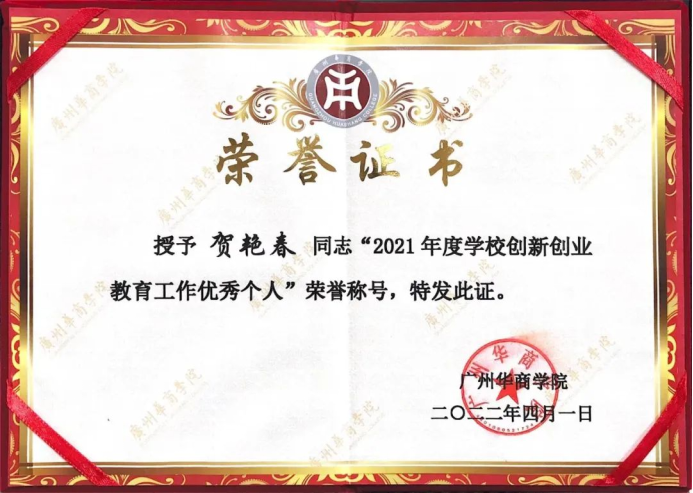 根据《广东财经大学华商学院创新创业导师管理办法》(华商院〔2020〕22号)和《关于开展2021年广州华商学院创新创业教育工作先进单位及优秀个人申报的通知》文件精神,数据科学学院积极组织申报和推荐,最终荣获广州华商学院2021年度创新创业教育工作“先进单位”称号,学院贺艳春老师荣获“创新创业教育工作优秀个人”称号。