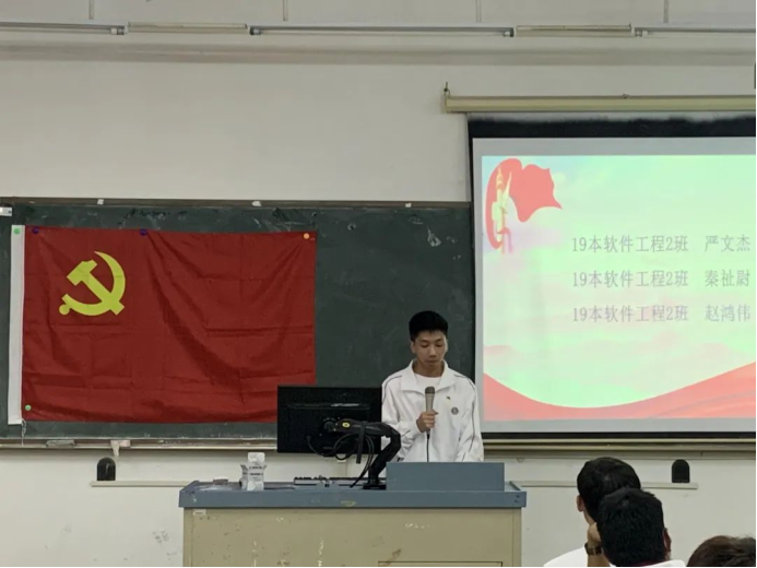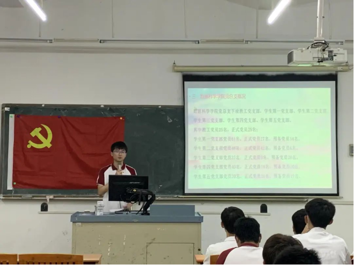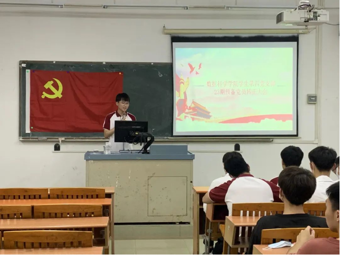 大会第三项为介绍党支部概况。数据科学学院党委下设教工党支部,学生第一党支部、学生第二党支部、学生第三党支部、学生第四党支部、学生第五党支部。其中教工党员25名,正式党员25名;学生第一党支部党员61名,正式党员27名,预备党员34名;学生第二党支部党员48名,正式党员42名,预备党员6名;学生第三党支部党员37名,正式党员9名,预备党员28名;学生第四党支部党员40名,正式党员14名,预备党员26名。学生第五党支部党员39名,正式党员20名,预备党员19名。