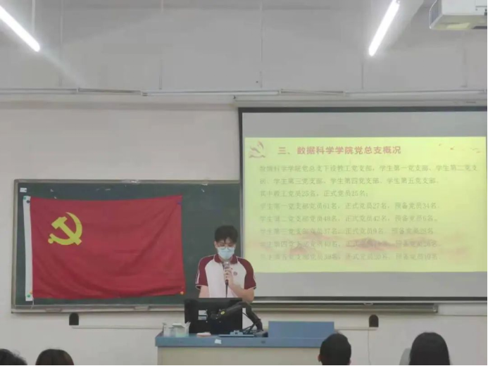 大会第三项为介绍党支部概况。数据科学学院党委下设教工党支部和学生第一党支部、学生第二党支部、学生第三党支部、学生第四党支部、学生第五党支部。其中,教工党员25名,正式党员25名;数据科学学院学生第一党支部党员61名,正式党员27名,预备党员34名;数据科学学院学生第二党支部党员48名,正式党员42名,预备党员6名;数据科学学院学生第三党支部党员37名,正式党员9名,预备党员28名;数据科学学院学生第四党支部党员40名,正式党员14名,预备党员26名;数据科学学院学生第五党支部党员39名,正式党员20名,预备党员19名。
