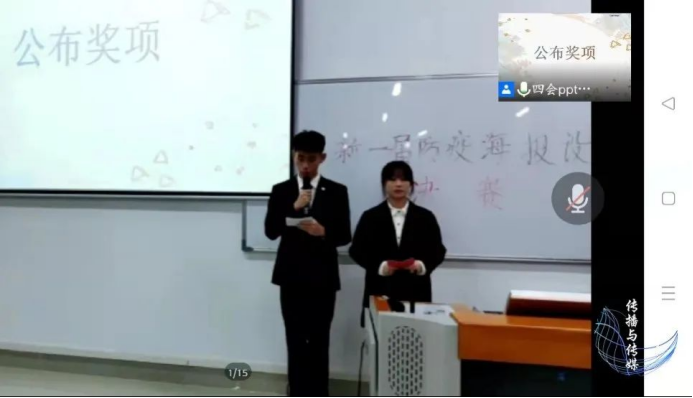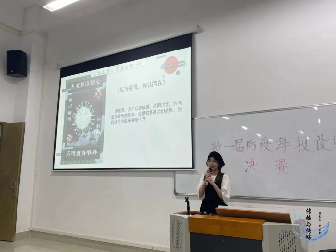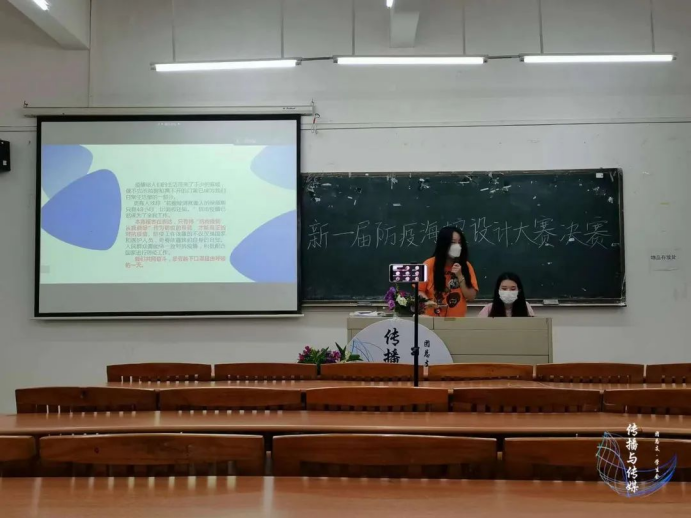 一曲过后,杨伟捷老师对此次活动的最后总结,对同学们防疫海报做出了高度的肯定和赞扬,他提出在当下疫情形势,身为传播与传媒学院的同学们要运用所学的知识来呼吁大家遵守疫情防控工作,齐心协力抗击疫情,为学校防疫工作添砖加瓦。