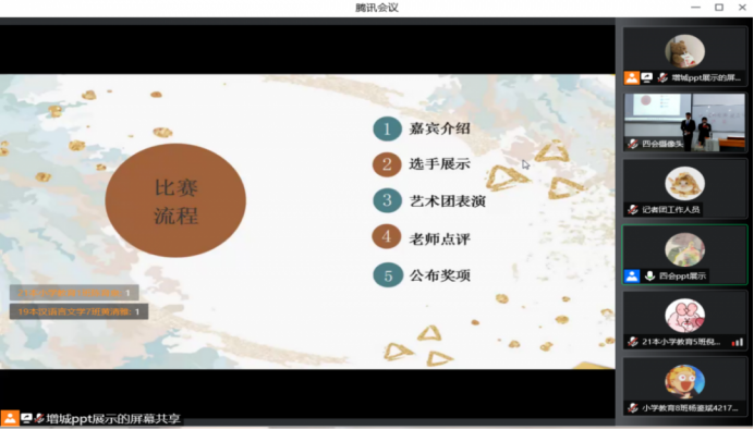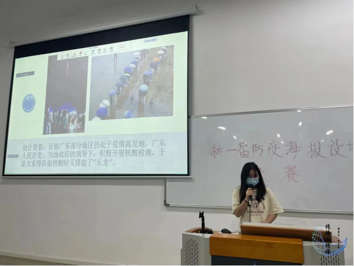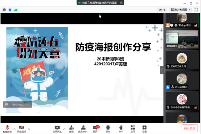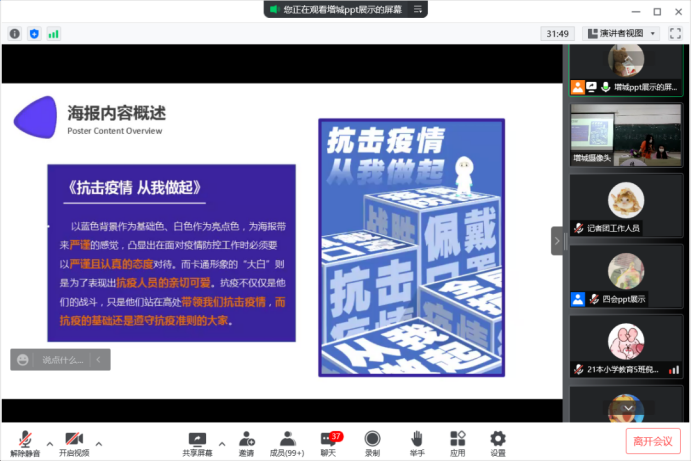 主持人介绍完本次比赛流程后,比赛正式开始,8名参赛选手依次进行精彩的作品展示和作品解说,从大家的作品中可以看出华商学子们共同抗疫的决心,相信观众们听完8位选手的对作品的简述,一定对抗疫更加重视与充满信心。我们也坚信真正能脱下口罩呼吸新鲜空气的美好日子终将到来!
