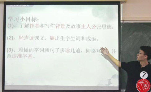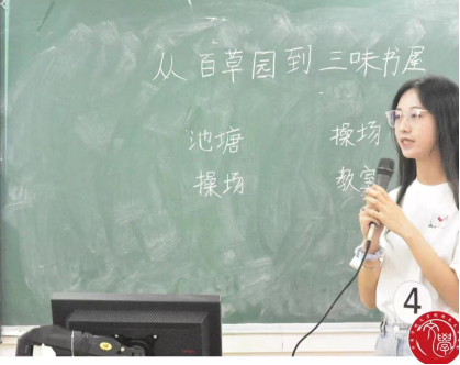 选手们熟练运用新媒体设备,通过制作完善精美的PPT向在场评委老师及其他选手们展示自己准备已久的试讲教学内容。选手们多采用幽默风趣的话语,在解析课文前抛出问题,引导同学思考。且这种做法并非是框架式的思维,更多的是让同学们形成自己的理解,构成自我思维体系。