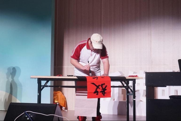 几位同学让我们享受了一场乐器的狂欢。源远流长的文化,历史和地域特征,造就了中国人与生俱来又花样繁复的语言生态。一纸一砚一世界,一笔一墨一人生,感受美,欣赏美,创造美,展示美,几位同学给我们展示书法作品,让我们知道,如诗如画新天地,锦上添花书法城。