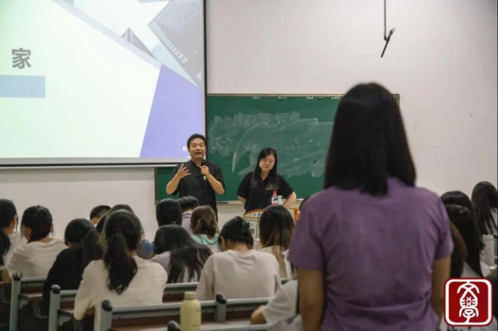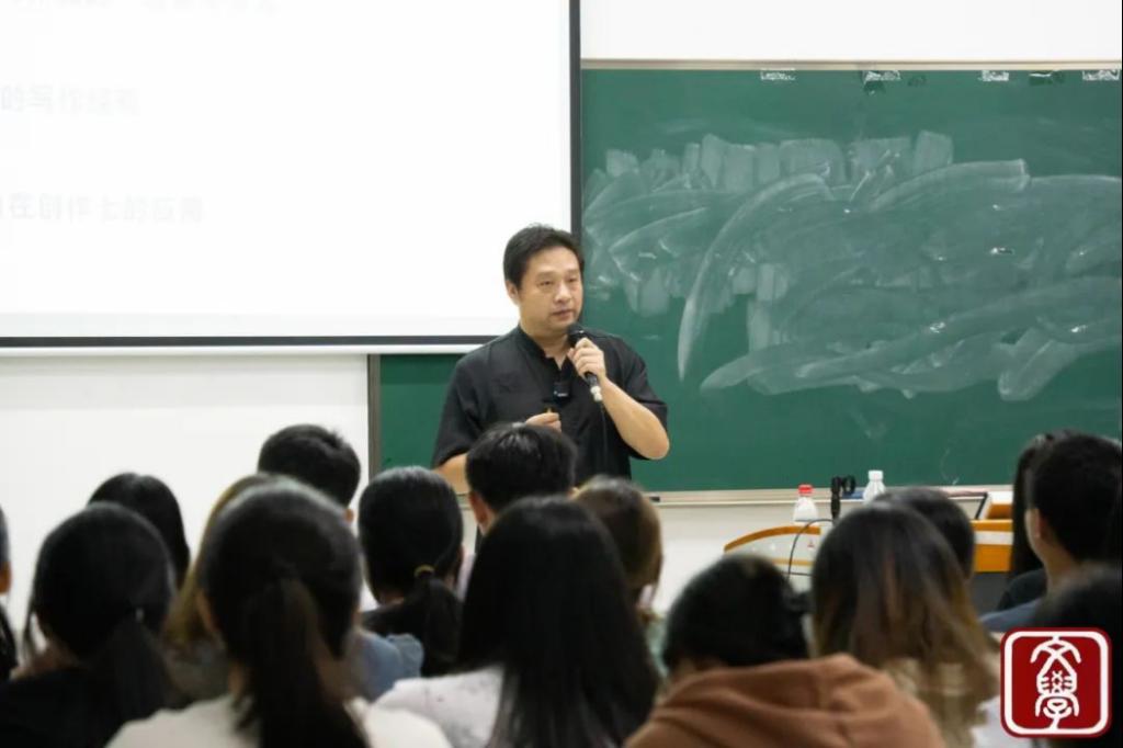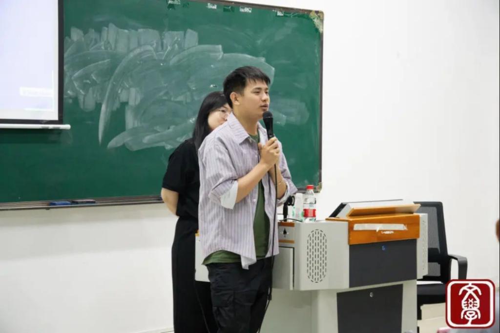 最后,文学院创意写作教研中心黄厚斌老师上台发言,鼓励同学们积极参与超级写作梦工坊的各项活动。他分享了自己以前参加写作训练的故事,向大家介绍了超级写作梦工坊的优点,并表示将全力支持梦工坊各项工作和活动开展,为同学们提供更好的学习和成长环境。