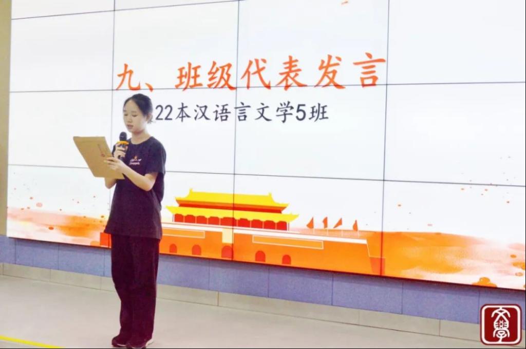 作为班级代表,22本汉语言文学5班的李晓汇同学上台发言。她表示,作为新时代的青年,我们肩负着历史赋予的使命,要以昂扬的斗志和不懈的努力,为实现中华民族伟大复兴的中国梦努力奋斗。