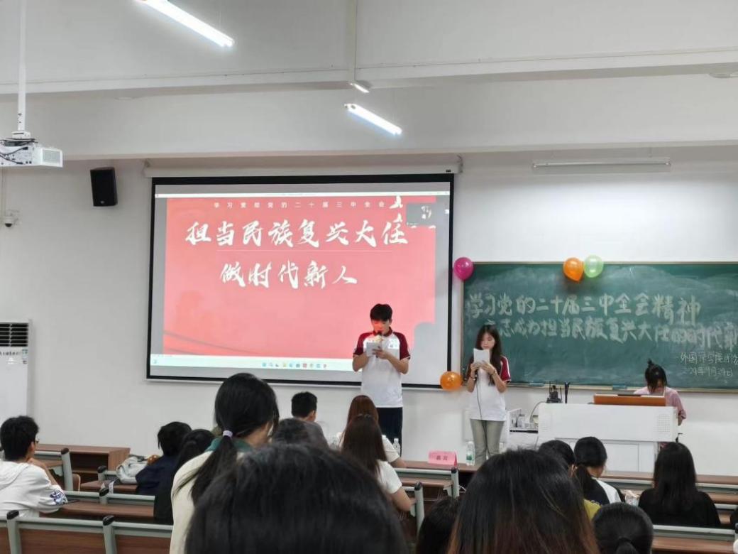 党的二十届三中全会科学谋划围绕推进中国式现代化进一步全面深化改革的总体部署,彰显了以习近平同志为核心的党中央将改革进行到底的坚强决心和强烈使命担当。这次全会在新征程上高高举起改革开放伟大旗帜,坚定不移走中国式现代化道路,具有继往开来的里程碑意义。党的二十届三中全会顺利召开,审议通过了《中共中央关于进一步全面深化改革、推进中国式现代化的决定》,为我们指明了前进方向,提供了根本遵循。在要求下,外国语学院团委于9月24日19:30,在肇庆校区16号楼208教室举办以“学习贯彻党的二十届三中全会精神,立志成为担当民族复兴大任的时代新人”为主题的九月团生总结大会。活动对象为外国语学院大一至大三全体学生。