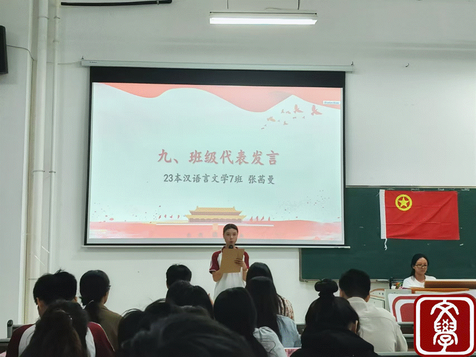 会议第九项议程,由23级汉语言文学7班张茜曼同学进行发言。