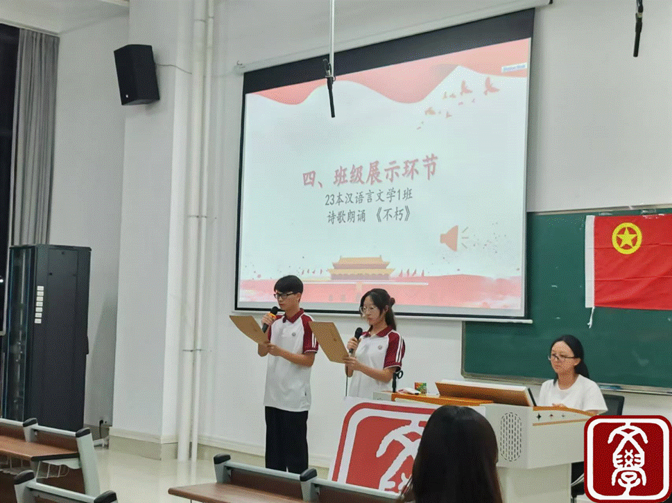 大会第四项议程,班级展示环节。由23级汉语言文学1班的同学为我们带来的朗诵《不朽》。