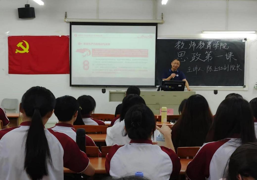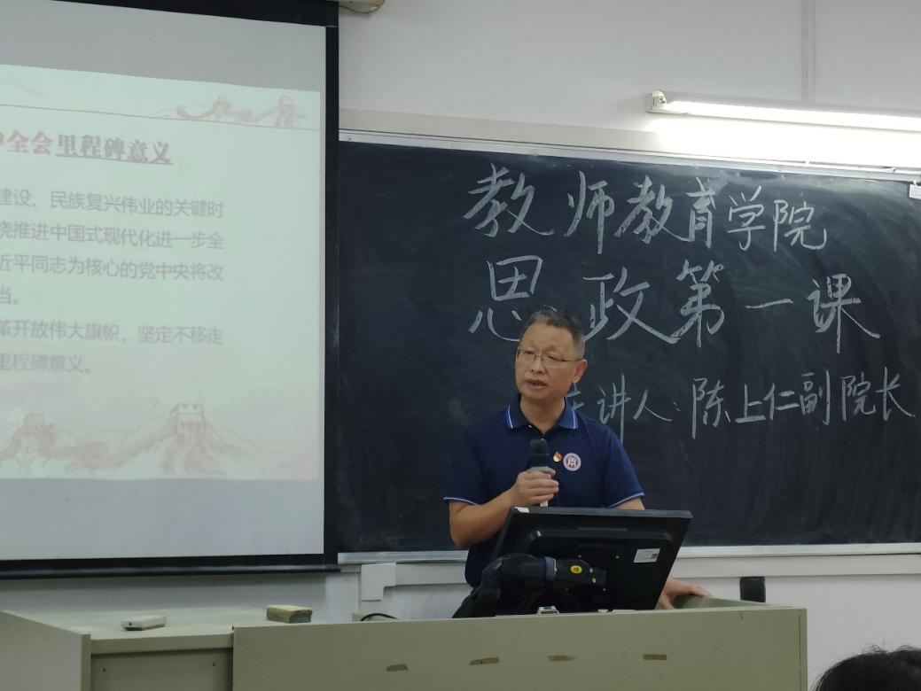 为全面贯彻党的教育方针,深入学习党的二十届三中全会精神,把握时代发展大势。教师教育学院于2024年11月6日下午14:00在广州校区厚德楼C509和肇庆校区8号楼108开展2024年秋季学期“思政第一课”,旨在引导青年担当时代使命,以青春之力投身新时代,为中国式现代化贡献智慧与力量。本次思政课由教师教育学院陈上仁副院长、教师教育学院学生工作办公室江庆基副主任主讲。
