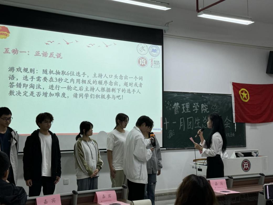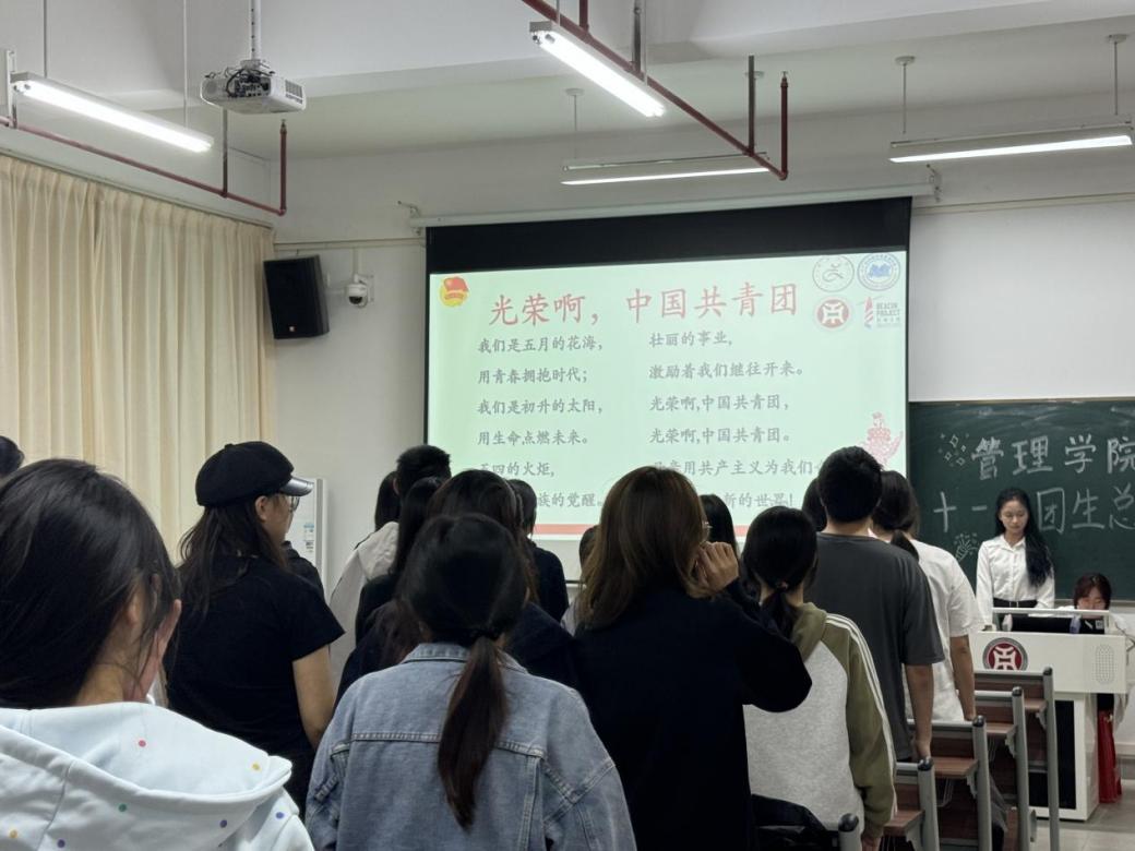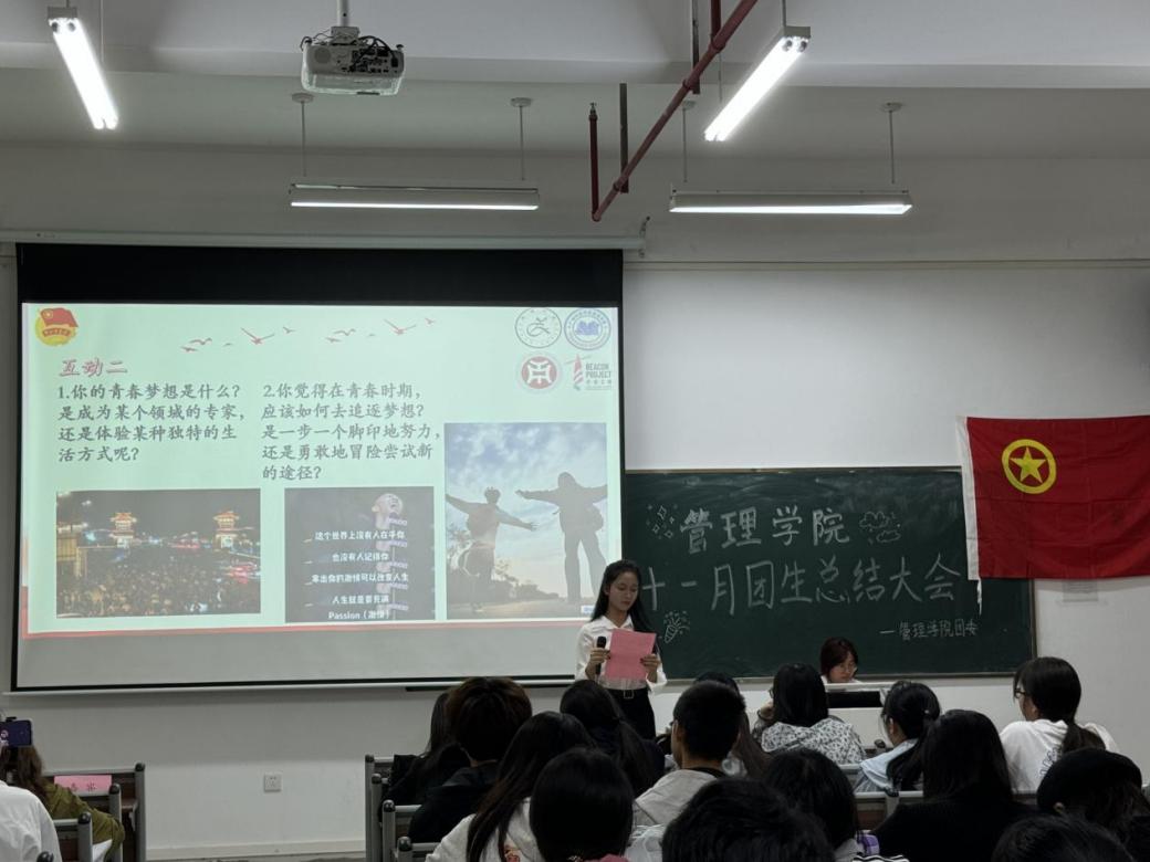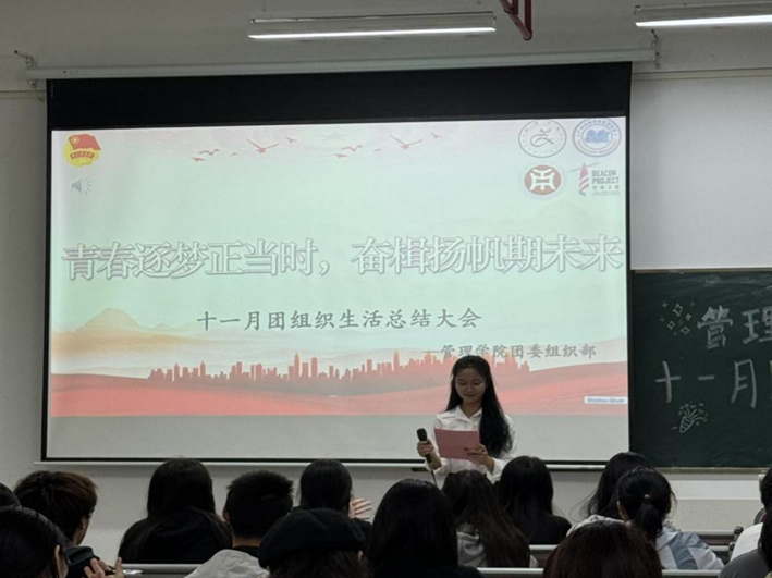 管理学院团委于11月21日晚上7时,在肇庆校区8号楼308教室举办主题为“青春逐梦正当时,奋楫杨帆期未来”十一月团组织生活总结大会,广州校区采用线上直播的形式同时举行。