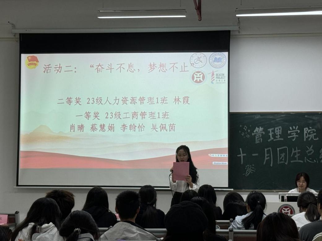 在“奋斗不息,梦想不止”的活动中,荣获一等奖的同学是23级工商管理1班肖晴、蔡慧娟、李翰怡、吴佩茵 ;荣获二等奖的同学是 23级人力资源管理1班林霞。