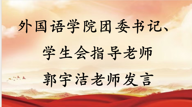 ——外国语学院团委书记、学生会指导老师郭宇洁老师发言。老师在发言中对本学期的工作开展给予肯定,提出展望:希望各部门工作人员在未来的工作中,以严谨的态度做好各项工作,同时也应各司其职,团结协作,加强各部门之间的合作、联动,践行“为同学服务”的宗旨,不断推动团委、学生会的建设与发展。