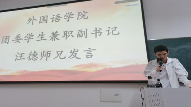 ——外国语学院团委学生兼职副书记汪德师兄发言。师兄对本学期的工作进行了基本的概述与总结,指出工作中存在的不足,希望大家能积极改正。同时,也对新学期的工作提出了展望与目标。