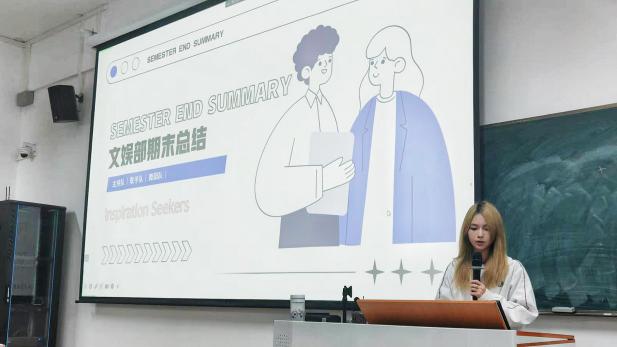——团委、学生会各部门负责人代表发言。各部门负责人对所在部门本学期各项工作的完成情况进行总结,反思了工作中存在的不足,并提出各自所属部门:新学期的工作计划,回顾过去,展望未来,相信各部门的工作会更加顺利开展。