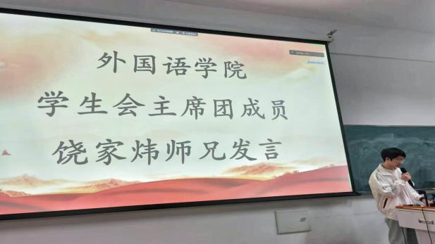 ——外国语学院学生会主席团成员饶家炜师兄发言。师兄对本学期的工作开展进行了阶段性总结,对新学期的工作提出要求,希望全体工作人员严于律己 团结一心。