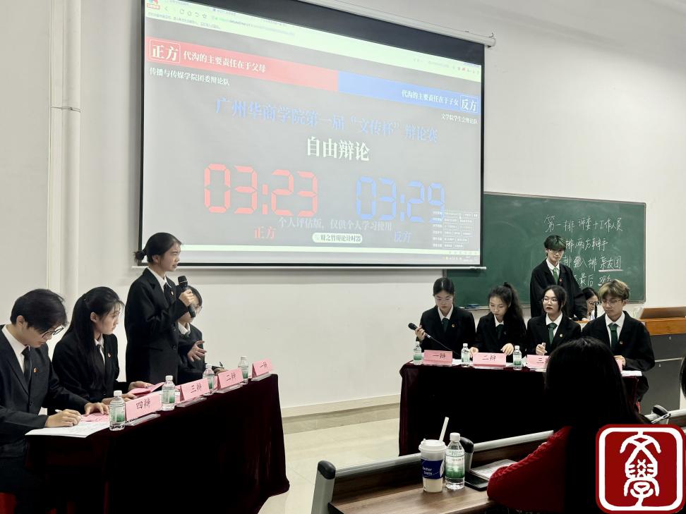 语言是思想的衣裳,辩论是智慧的舞蹈。为培养华商青年们形成善于思辨、乐于探索的求学之风,广州华商学院文学院学生会辩论队以及传播与传媒学院团委辩论队携手举办了第一届“文传杯”辩论赛,于2024年11月21日晚上20:00在肇庆校区6号楼205课室顺利开展。