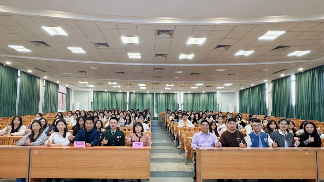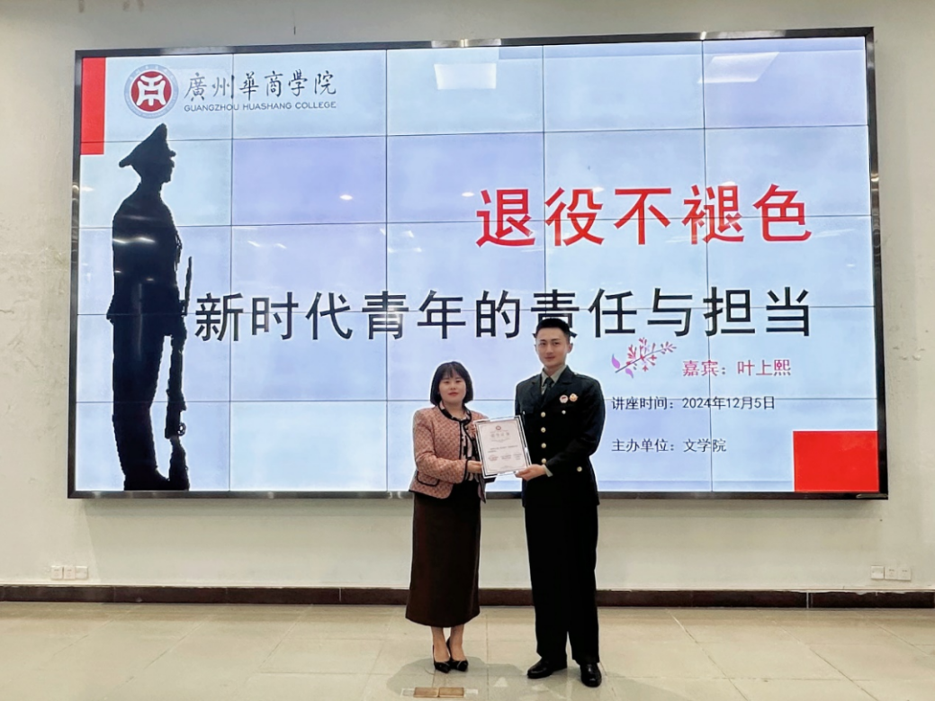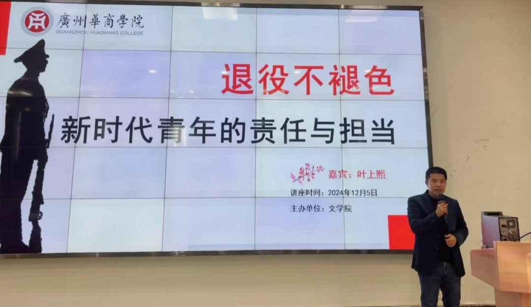12月5日,广州校区内一场以“退役不褪色—新时代青年的责任与担当”为主题的讲座盛大举行。此次讲座由文学院主办,旨在弘扬退役复学大学生士兵的优秀品质,为广大学子树立榜样。 当日,广州华商学院副校长许娜、学生处处长黄国富、文学院党委副书记郭堪通、学校武装部老师郭锦荣、文学院学工办副主任王桂华等领导嘉宾出席,现场 180 多名学生齐聚一堂,共同聆听这场意义非凡的讲座。