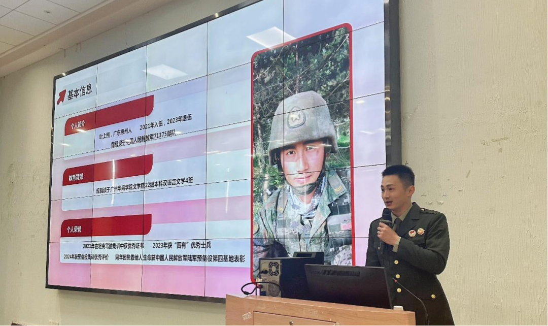 主讲人叶上熙,身为文学院 22级本科汉语言文学4班的退伍大学生,履历颇丰。2021 年在坦克驾驶集训中荣获优秀证书,2023年获评“四有”优秀士兵,2024 年于预备役集训获优秀评价,且同年因英勇救人获得中国人民解放军陆军预备役第四基地表彰。