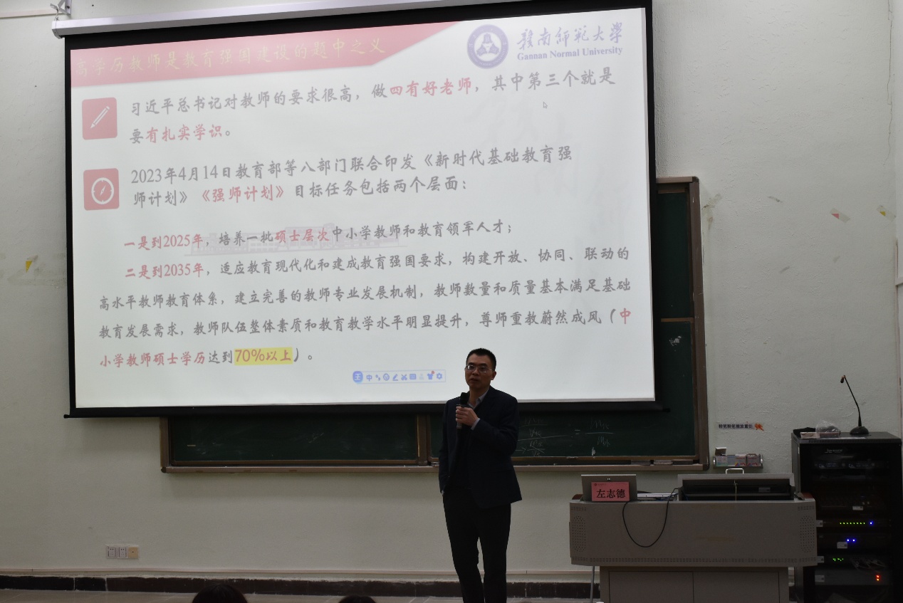 左志德教授在致辞中强调了高学历教师在教育强国建设中的重要性。他指出,习近平总书记对教师提出了“四有好老师”的要求,其中扎实的学识是关键之一。左教授还提到,随着社会的发展和教育政策的推动,高学历已成为社会文明进步的重要特质,也是个人成长的重要工具。在AI时代,高阶思维更为重要,教师需要不断提升学历和专业素养,以应对教育生的变化。