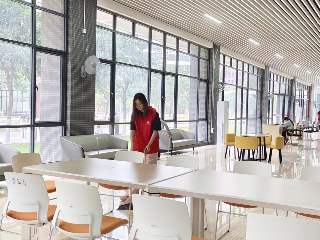 经过一个小时的共同努力,学业帮扶中心内环境焕然一新:桌椅排列整齐,地面干净明亮,学习氛围更加舒适有序。此次活动不仅改善了同学们的共学环境,也让志愿者们在劳动中体会到服务校园的成就感与归属感。