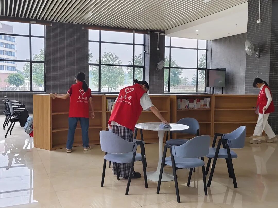 志愿者们认真擦拭自习区的桌椅,清理地面杂物,整理公共书桌,并对书角细节部位进行细致清洁。过程中,大家始终保持安静,遵守活动纪律,在维护环境整洁的同时也充分体现了对学习空间的尊重与爱护。