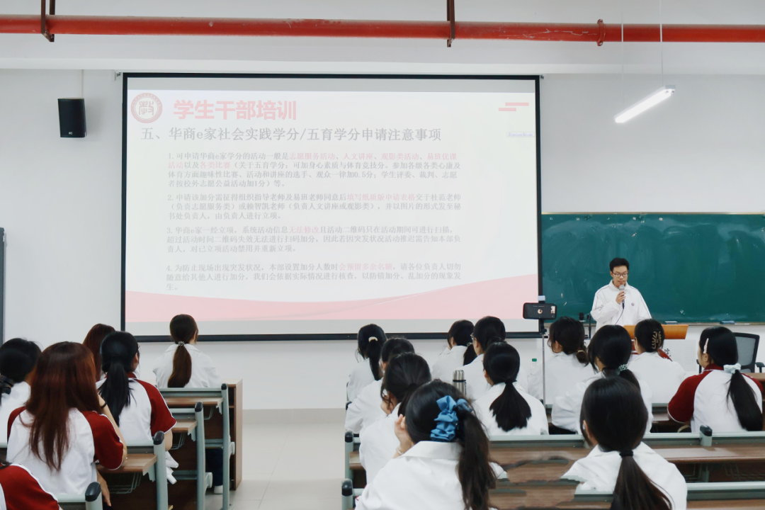 本次学生骨干培训会强调,学生干部队伍是服务师生、推动学院工作的重要力量,新学期培训重点围绕以下五个方面展开:一是角色转变与担当,引导从部员成长为团队“主心骨”,协助统筹、做好表率;二是高效团队建设,明确部门工作内容、任务分工及流程规范,及时汇报进度,提高效率;三是情绪管理与压力疏解,及时减压,积极调整心态;四是部门文化塑造,从“做活动”向“建品牌”提升,凝聚共识、打造归属感;五是讲解华商E家加分流程,明确可加分活动类型及不同活动加分标准,强调加分立项注意事项。