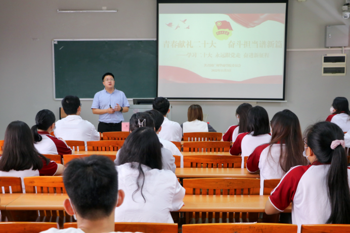 为了深入学习宣传贯彻党的二十大精神,把握学生社团发展的正确方向,助力学生社团育人功能发挥,推动我校社团健康有序发展,加强我校社团管理部工作人员、学生社团负责人的理论学习和培训,把我校学生社团的思想统一到党的二十大精神上来,把力量凝聚到党的二十大确定的各项任务上来,11月11日中午12:15,校团委主办、校团委社团管理部承办的广州华商学院学生社团“学习二十大、永远跟党走、奋进新征程”专题学习会在启智楼302顺利举办。校团委陈刚书记、校团委杨图珍老师、社团管理部学生骨干以及各学生社团负责人共同参加本次学习会。