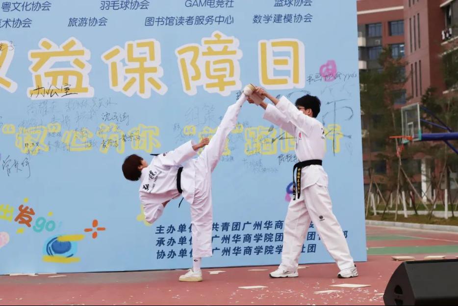 体育协会——跆拳道表演。体育协会的跆拳道表演热情洋溢,彰显了华商学子积极向上的精神面貌。
