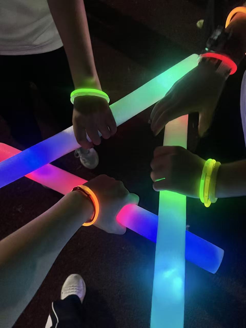 工作人员提前就位,为每位参与者发放色彩斑斓的荧光手环与荧光棒。大家手持荧光道具,在轻松欢快的氛围里完成佩戴,让荧光元素在夜色中提前点亮活力。