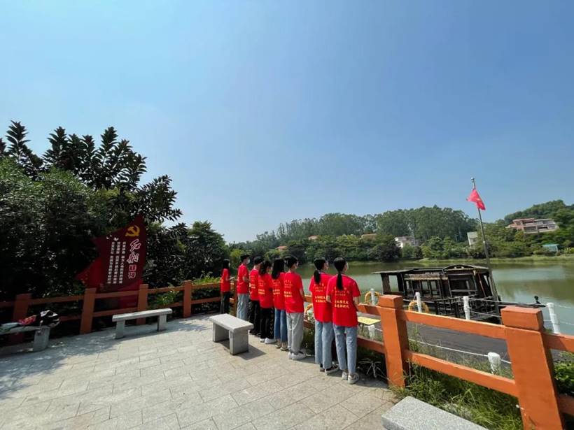 2021年7月28日,实践队前往广州市增城区大埔围村入党碑前诚挚宣誓。面向党旗,入党的铮铮誓词始终回响在耳边,在对往昔峥嵘的无限追忆、缅怀中,队员们认识到东江纵队的英雄气魄和中国共产党的正确领导。