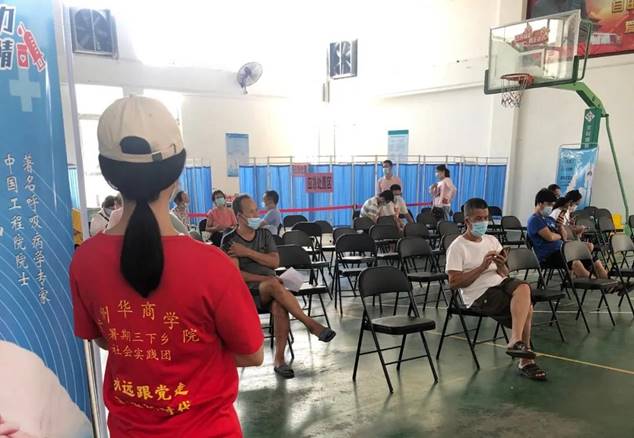 7月27日上午,实践队队员们赴防疫一线,在广东省汕头市南澳县后宅镇全民健身广场新冠疫苗临时接种点进行志愿服务。协助工作人员维持现场秩序、引导居民有序排队、扫码登记、填表等候、进行接种。