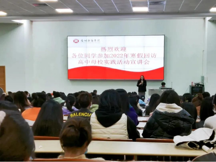 为更好地贯彻落实素质教育和实践教育,鼓励广大华商学子积极参与到“感恩母校行”社会实践活动中来。2021年12月20日—21日分别在增城校区和四会校区开展2022年寒假母校回访活动宣讲会,出席本次宣讲会的有华商学院招生办公室主任姚见花,招生办公室杨阳老师、谢银月老师以及参与本次活动的201个回访小组的400多名队伍代表。