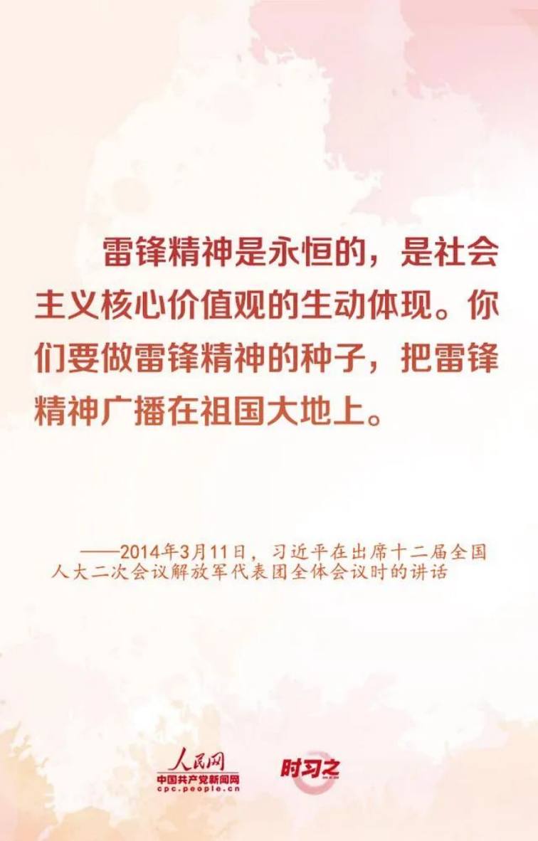 2014年3月11日,在十二届全国人大二次会议解放军代表团全体会议上,习近平同志强调“雷锋精神是永恒的,是社会主义核心价值观的生动体现。