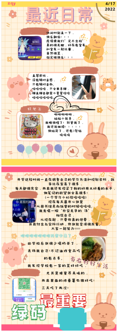 2022年4月17日至4月20日,校学生会心理健康总站举办的“帐”量美好线上手账活动顺利举行。此次活动以“记录校园日常”为主题,鼓励同学们通过做手账的方式发现生活中的小美好。