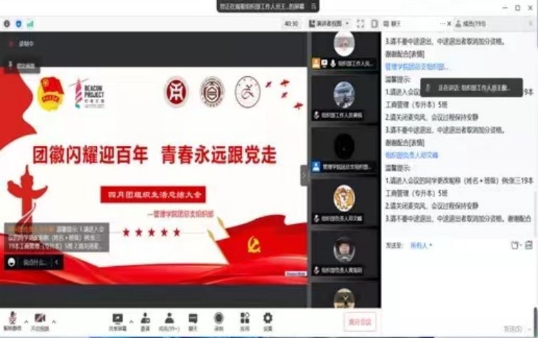 4月21日19:00,管理学院团总支在腾讯会议开展“团徽闪耀迎百年,青春永远跟党走 ”四月团组织生活总结大会。总结大会引导同学们时刻牢记总书记嘱托,在第二个百年奋斗目标的伟大征程上,担当作为、拼搏奋进,为国家发展、民族复兴贡献青春力量,以实际行动迎接党的二十大胜利召开!用青春和汗水创造新的奇迹,不负党的期望、人民期待、民族重托,争当时代的弄潮儿。