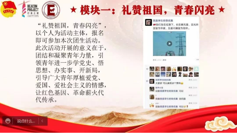4月25日19:00,经济贸易学院团总支在腾讯会议举行“团徽闪耀迎百年,青春永远跟党走”四月团组织生活总结大会。总结大会强调,作为一名新青年,我们生活在这个美好的新时代里,更应在党的坚强领导下,在这个来之不易的和平稳定的环境下,发挥出属于青年最昂扬向上的力量,脚踏实地、勤勤恳恳地投身于民族复兴的奋进力量当中,传承中华民族最美好的精神品质!