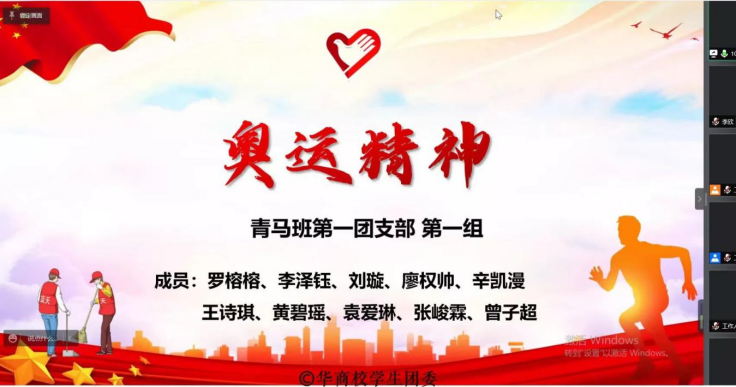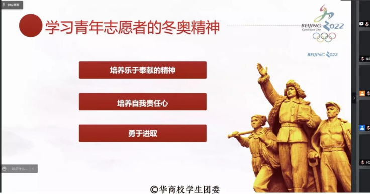 至此,“观冬奥竞赛,领大国风范”青马班分享会活动圆满结束。青春志愿行,奉献新时代,通过分享冬奥会志愿者们亲身经历,展现了新一代青年的责任与担当,不负时代,不负人民,以自己的方式回报党中央对青年一代的关心,实现党对青年的寄托,更好地诠释了为人民服务的崇高理念。此次分享会使学员们对于奥运精神有了新的领悟和见解,践行了习近平总书记在冬奥会、冬残奥会总结表彰大会上的重要讲话精神,传递出华商青年青春心向党,永远跟党走的赤子之情,以更加积极饱满的心态去迎接新的开始,开展更加有价值的人生。