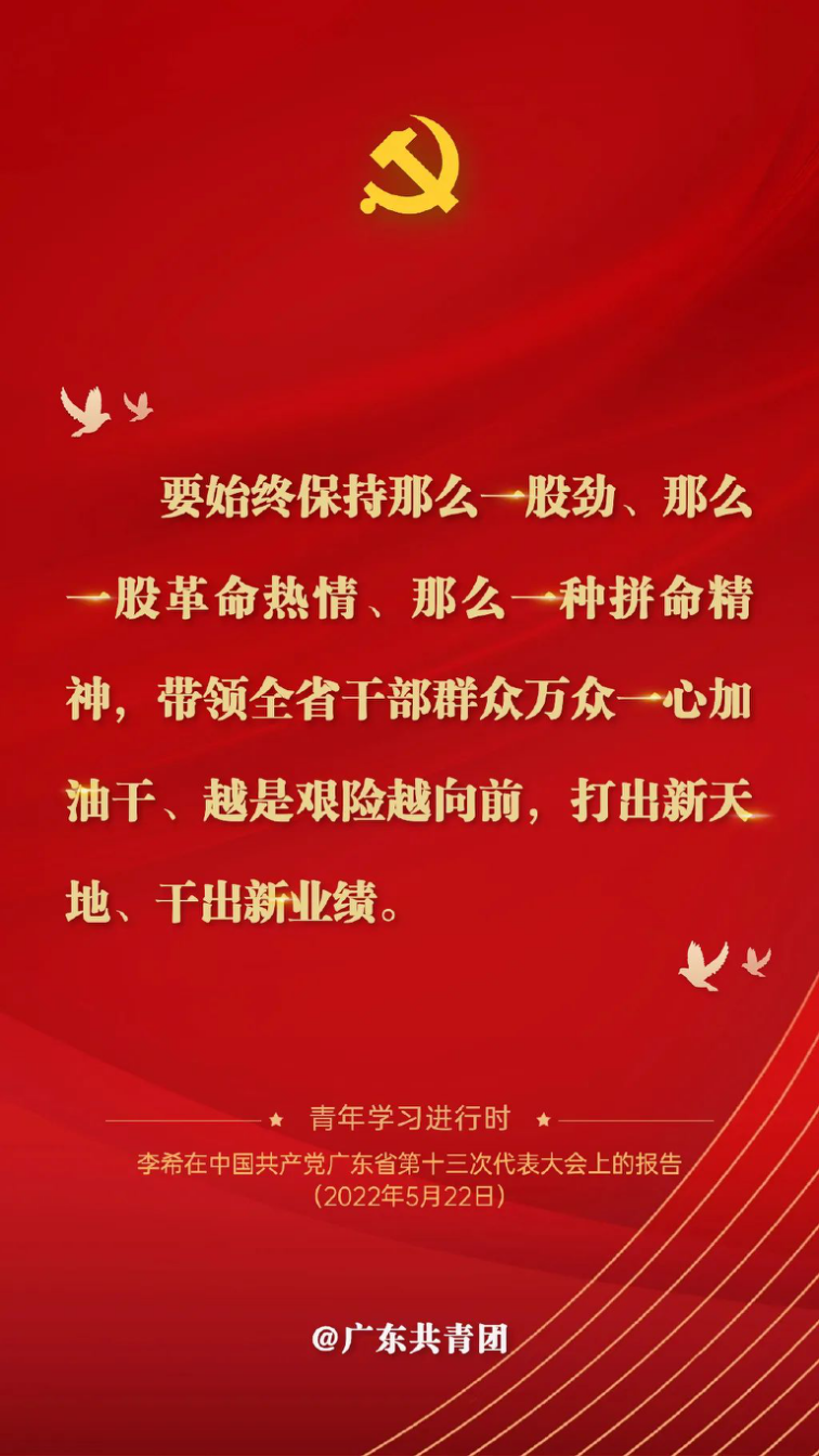 5月22日至25日,中国共产党广东省第十三次代表大会在广州召开。李希代表中国共产党广东省第十二届委员会向大会作了题为《忠诚拥护“两个确立”坚决做到“两个维护” 奋力在全面建设社会主义现代化国家新征程中走在全国前列创造新的辉煌》的报告。大会深刻总结了过去五年的奋斗历程和重大成就,对未来五年做出引领规划,体现了全省人民群众的共同期盼。