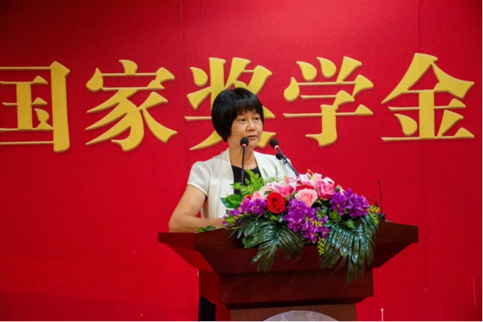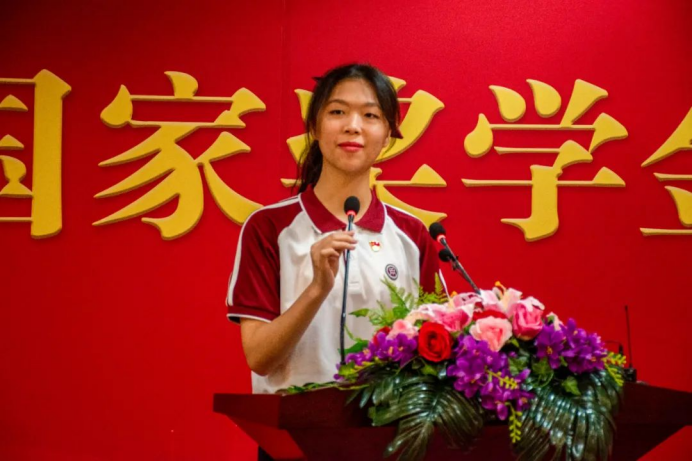 获国家奖学金学生代表黄楚蕾同学发言,她分享了自己的学习经历及获奖经历,祝愿同学们能够突破自我,收获锦绣未来,祝愿学校英才辈出。
