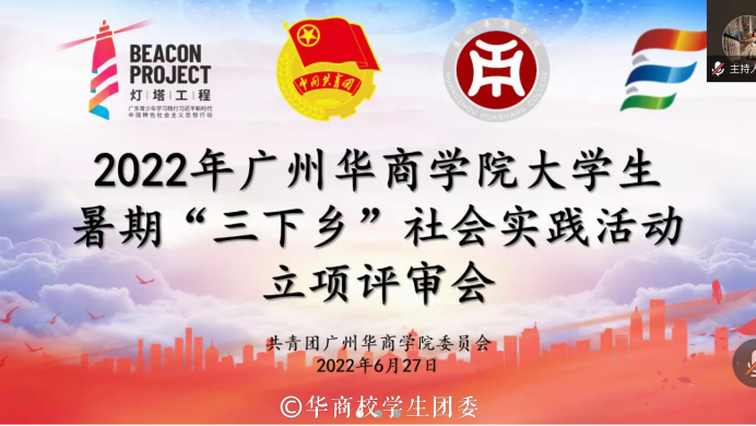 为深入学习贯彻党的十九届六中全会精神和习近平总书记在庆祝中国共产主义青年团成立 100 周年大会上的重要讲话精神,引导和帮助广大华商青年上好与现实相结合的“大思政课”,在社会实践的课堂中受教育、长才干、作贡献,以优异的成绩迎接党的二十大胜利召开。根据广州华商学院2022年暑期“三下乡”社会实践活动预通知有关安排,广州华商学院2022年暑期“三下乡”社会实践活动立项评审会于6月27日18:30至次日凌晨00:30在线上召开在线上召开。