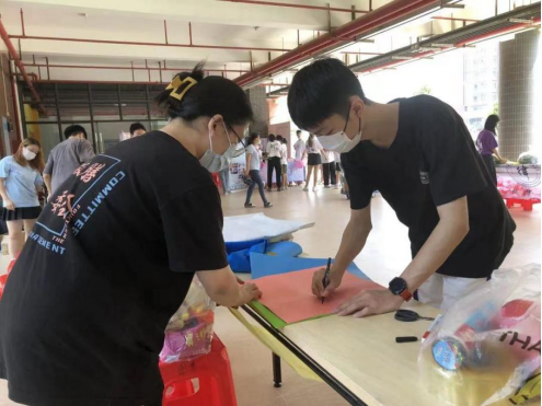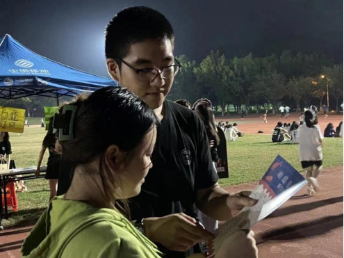 增城摆摊分工明确,部分工作人员留守摊点,帮助前来咨询的新生填写部门意向表;其余的工作人员在操场上流动宣传,向新生们逐一介绍组织和部门的工作特色。