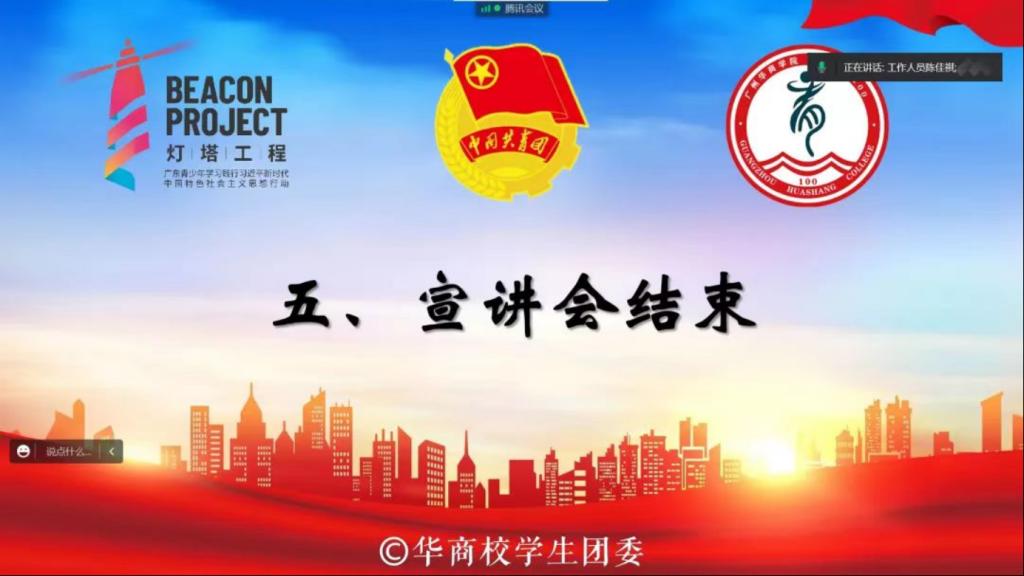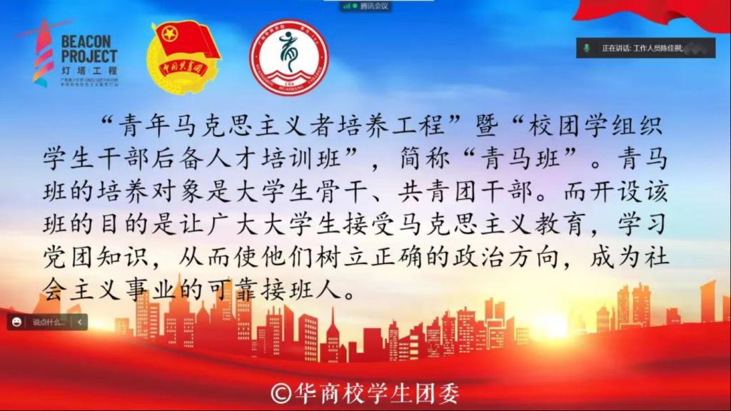 活动意义:校团委始终坚持习近平新时代中国特色社会主义思想,将“青马工程”作为履行“立德树人”根本任务和“思想引领”政治责任的重要载体。不断增强团组织的引领力、组织力、服务力,力求在推动马克思主义理论在青年中广泛传播、加强青年政治骨干培养的实践探索等方面做出积极成效。本次宣讲会有效增强了广大华商青年对“青年马克思主义者培养工程”培训班的认识,推动马克思主义理论在青年中广泛传播,激励我们牢记青春使命,践行“请党放心,强国有我”的青春誓言,成长为有理想、敢担当、能吃苦、肯奋斗的新时代好青年,为实现中华民族伟大复兴贡献出自己的青春力量。