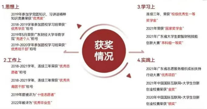 实践提升,屡创佳绩。课外实践方面,她积极参与各类提高自己个人能力的比赛及活动。两次参加中国国际“互联网+”大学生创新创业大赛,在第六届校赛获得银奖,在第七届校赛获得金奖并被推选代表学校参加省赛。假期中,她主动尝试与专业相关的实习工作,先后协助广州市先正信息咨询有限公司进行惠州市佳兆业中心三期、汕头市五矿御园等项目的土地增值税清算工作,在君健财税集团和深圳化贝咨询公司参与税收筹划工作。