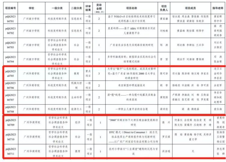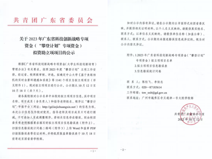 10月18日,由团省委、省财政厅联合设立的广东省科技创新战略专项资金(大学生“攀登计划”科技创新培育)2023年申报立项结果公示结束,我校7个项目获得立项资助,其中重点项目1项、一般项目6项,共获得省财政专项资助12万元。